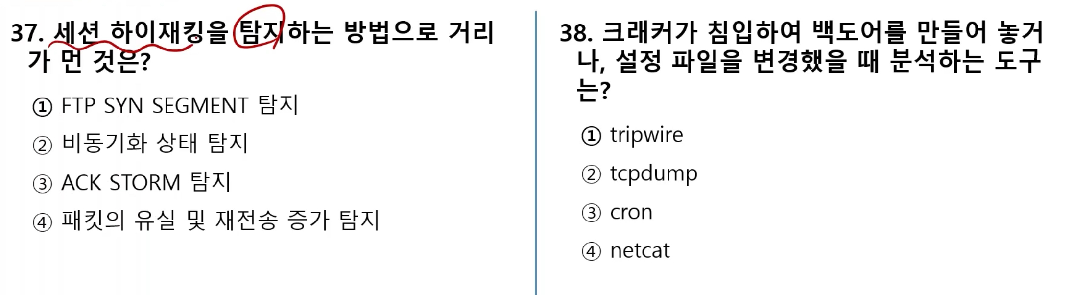 - 세션 하이재킹 탐지 기법: 비동기화 상태 감지, ACK STORM 탐지, 패킷의 유실 및 재전송 증가 탐지, 예상치 못한 접속의 리셋 탐지