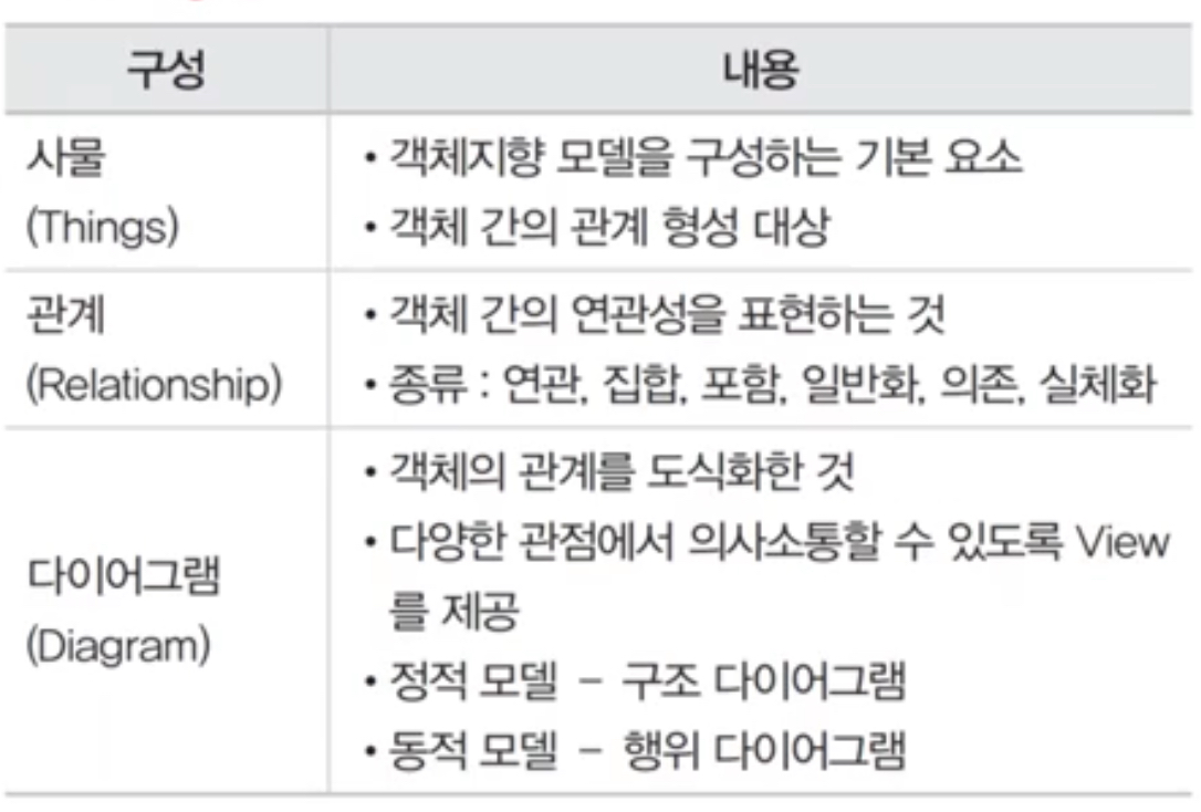 - 객체 모델링: 시스템에서 요구되는 객체를 찾아내어 속성과 연산 식별 및 객체 간의 관계를 규정하여 객체를 다이어그램으로 표시