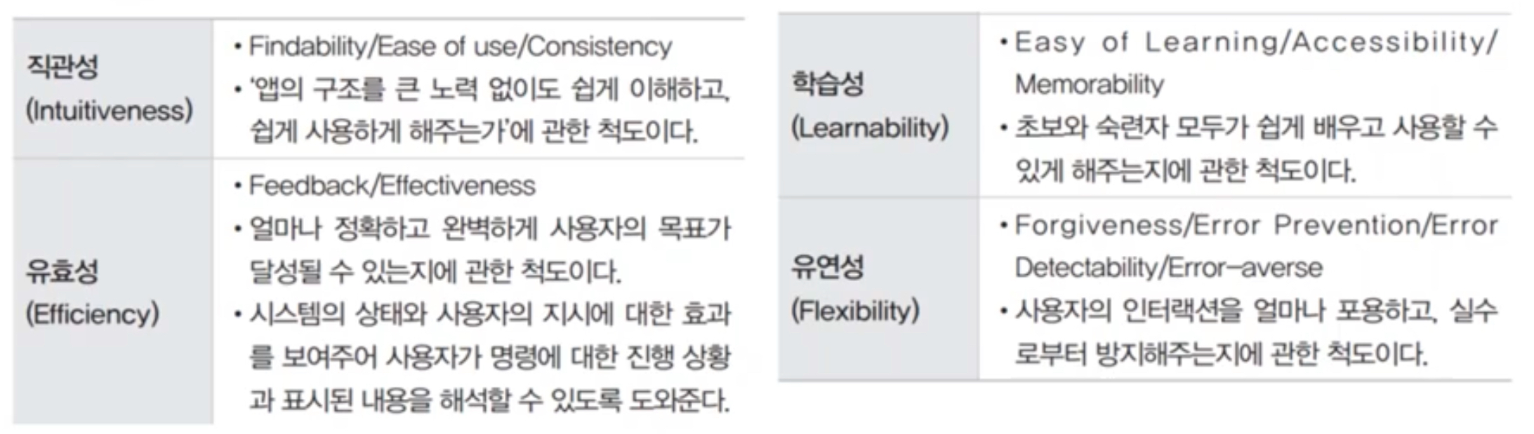 - 사용자 중심, 일관성, 단순성, 가시성, 표준화, 접근성, 결과 예측 가능, 명확성, 오류 해결 가능