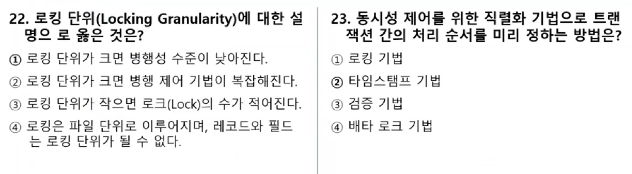 - 로킹 단위가 커지면 로크의 수가 적어 관리가 쉬워지지만 병행성 수준은 낮아진다