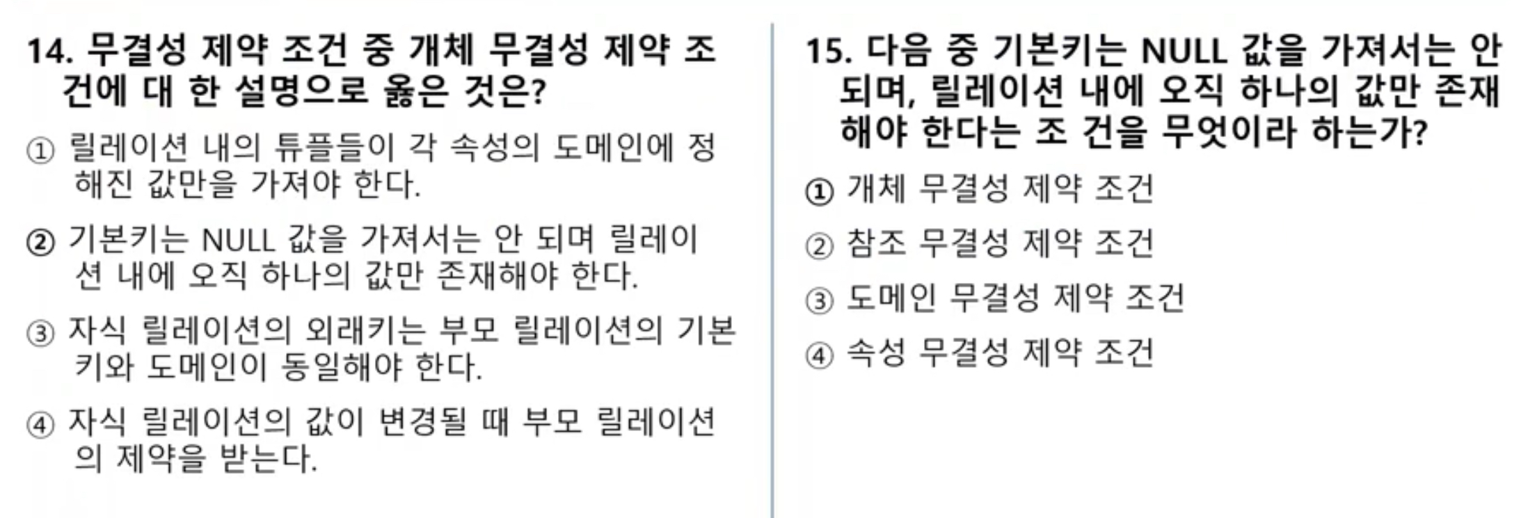 - 개체 무결성: 기본키의 값은 널(Null) 값이나 중복값을 가질 수 없다는 제약 조건
