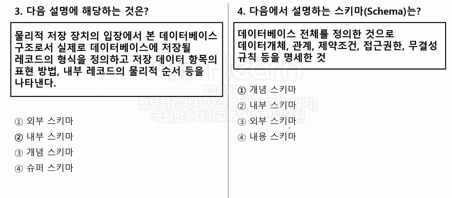 - 내부 스키마: 물리적 저장 장치, 실제로 데이터베이스에 저장될 레코드의 형식을 정의, 저장 데이터 항목의 표현 방법, 내부 레코드의 물리적 순서 등 나타냄