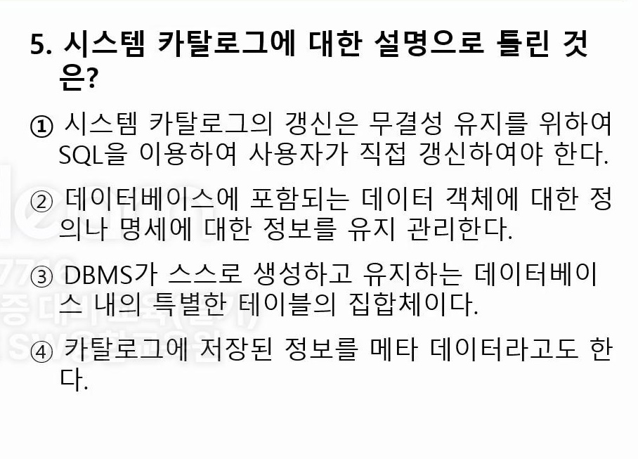- 시스템 카탈로그는 DBMS 가 스스로 생성하고 유지