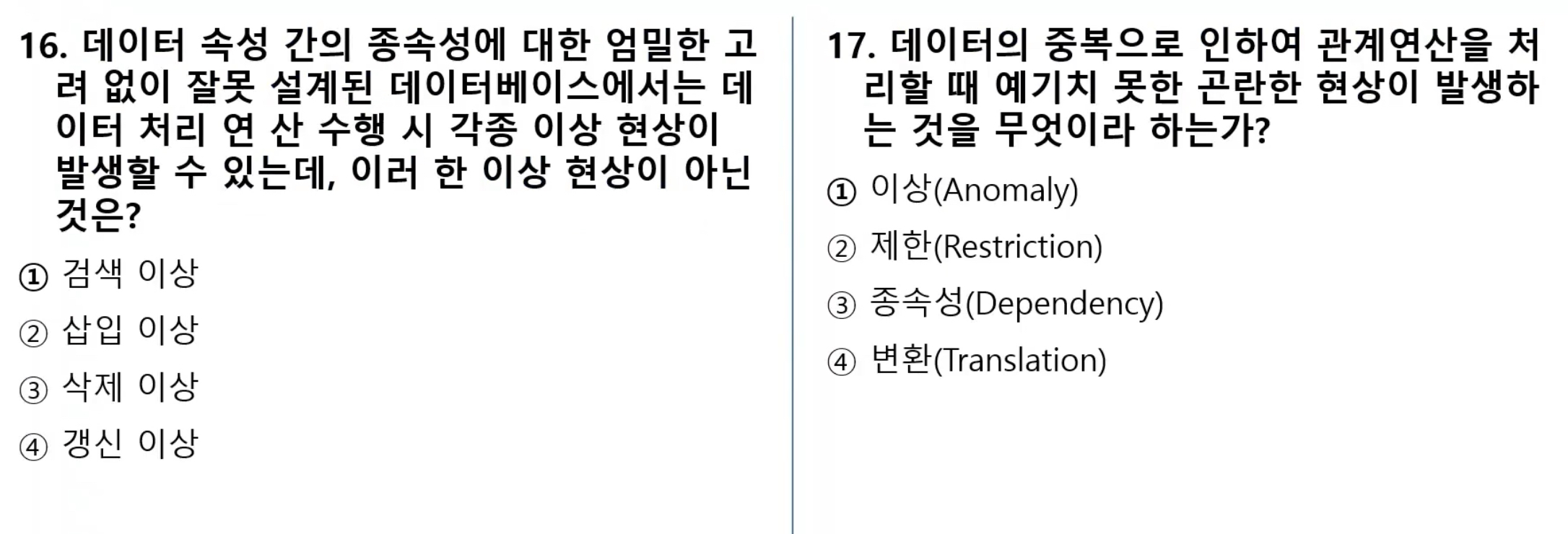 - 종류: 삽입 이상, 삭제 이상, 갱신 이상