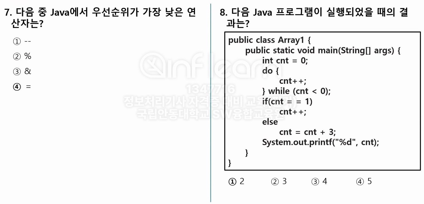 - 괄호() → 산술 연산자 → 비트 이동 연산자 → 관계 연산자 → 비트 논리 연산자 → 논리 연산자