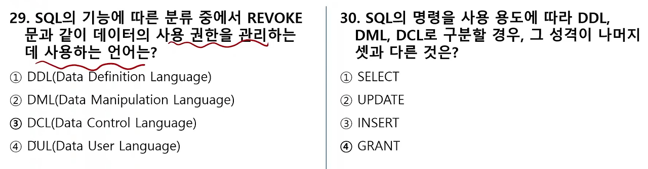 - REVOKE: 데이터 베이스 사용자로부터 권한 취소