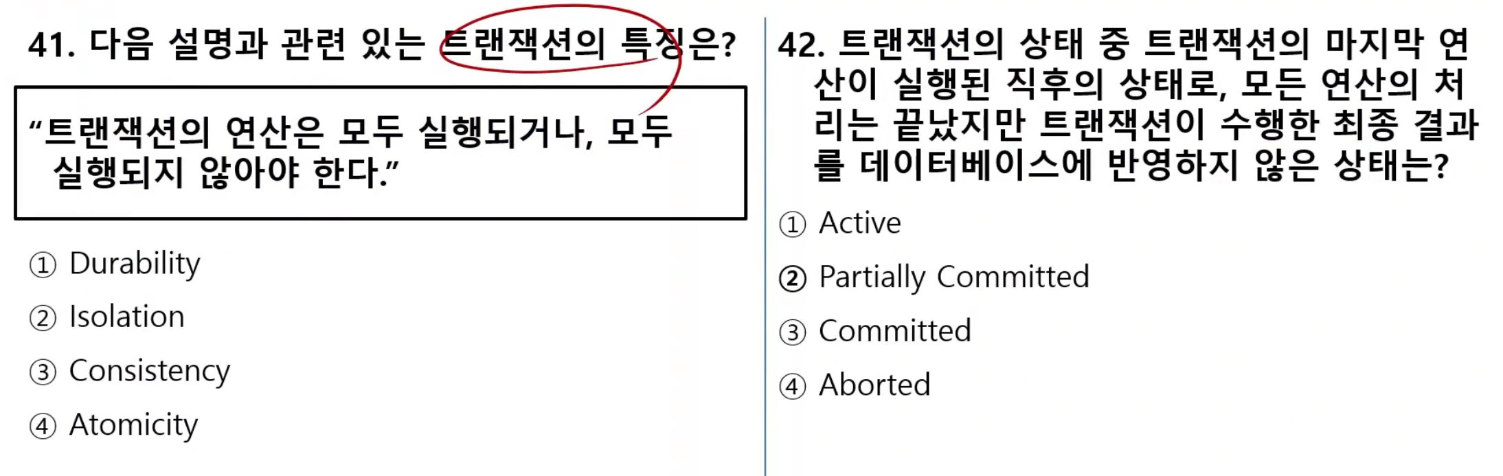 - 부분 완료: 트랜잭션의 마지막 연산이 실행된 직후의 상태, 모둔 연산의 처리는 끝났지만 트랜잭션이 수행한 최종 결과는 데이터 베이스에 반영하지 않은 상태