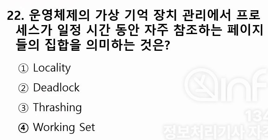 - 운영체제의 가상 기억 장치 관리에서 프로세스가 일정 시간 동안 자주 참조하는 페이지들의 집합
